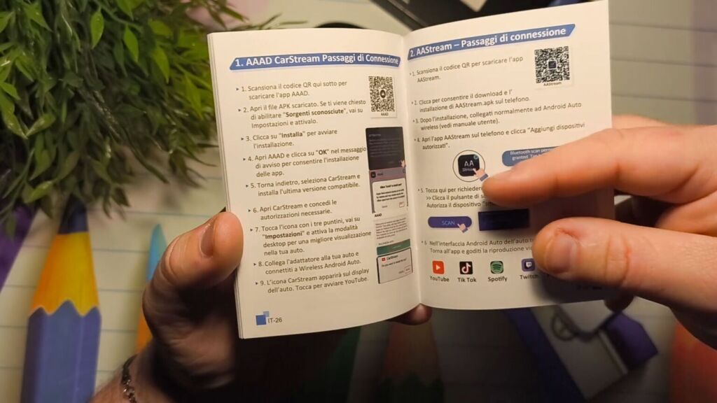 상자 안에는 무선 어댑터 본체와 USB-A/USB-A 연장 케이블(동글이 이 연결을 지원하여 좁은 공간에서 유용합니다)이 들어 있습니다. 또한, 최신 연결 기능을 제공하는 차량에서 제품을 사용할 수 있도록 USB-A-USB-C 변환 케이블도 포함되어 있습니다. 어떤 케이블을 사용하든, 패키지에는 장치를 고정할 수 있는 3M 접착 패드와 그림이 포함된 자세한 사용 설명서(이탈리아어 버전도 제공)도 함께 들어 있습니다.
