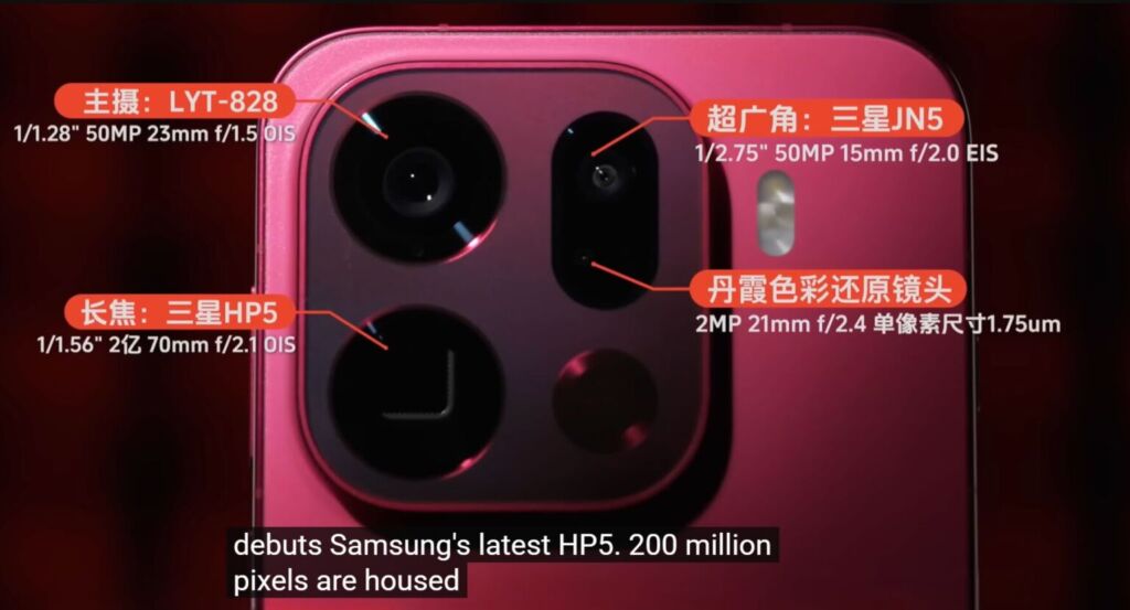 망원 렌즈 – 200Mpx 잠망경, 삼성 HP5, f/2.1, 70mm(잠망경 망원), 1/1.56″, 0.5µm, 3배 광학 줌, 다방향 PDAF, OIS